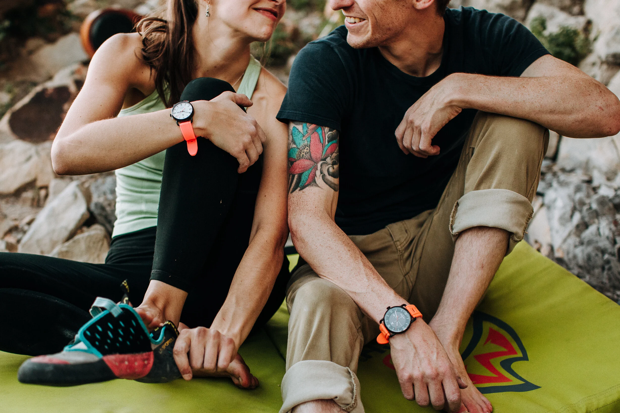 We came up with photos that would vary back and forth between the different interchangeable straps that 111 offers. They would emphasize the timeless and versatile look of the watches, as well as the safe use of watches in climbing. We decided we would do both bouldering + sport climbing as well as a focus on shots of Lacy carrying gear, putting climbing shoes on, chalking her hands, her and Jordan spotting each other while bouldering, the watch hanging off of her chalk bag, and rechalking her hands.