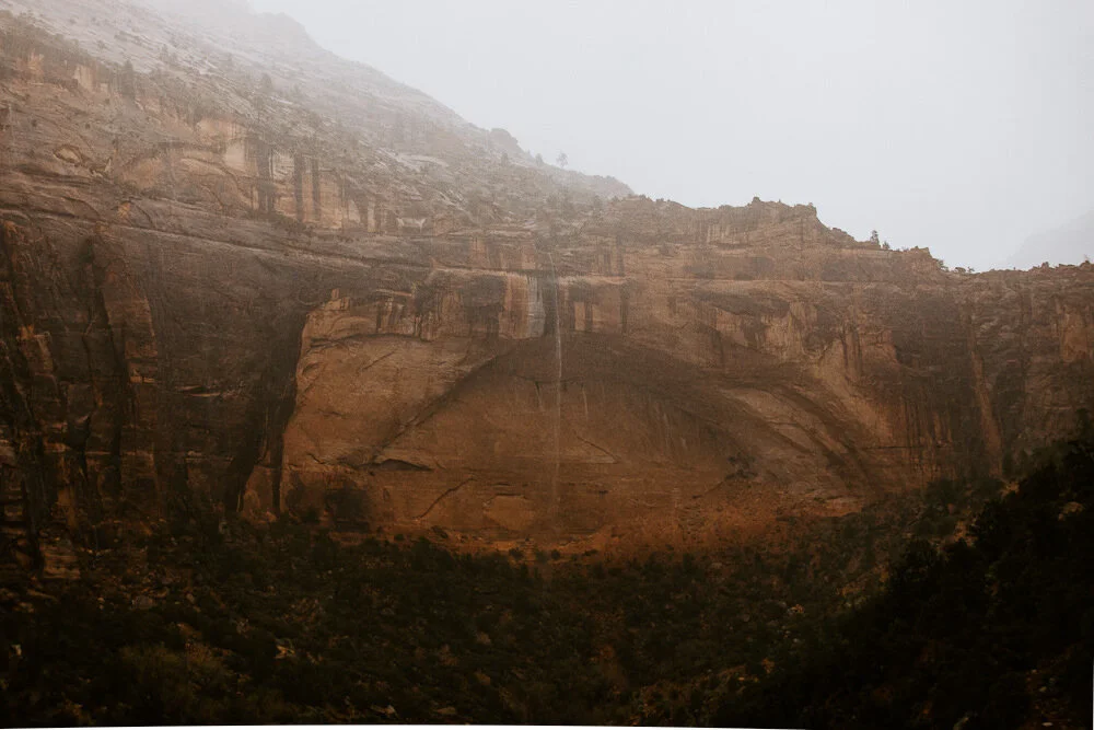 When we had visted in 2017, there are a few slot canyons accessible via the east entrance that we had hiked- it was INSANE to see them flooded with gushing water. The Virgin River which runs through Zion National Park ended up hitting a discharge of 200 cubic feet per second (it was around 65 when we arrived, and they close the narrows at 150), and the water of the river rose an entire foot. It was an absolute foggy, rainy, snowy, insane sight that I feel so lucky to have witnessed. To have booked this trip because I wanted to hike in the snow - and then to literally see every single season in four days, I was so happy.